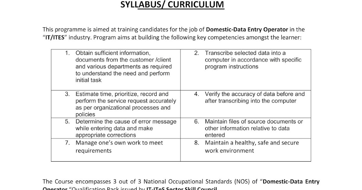 Here you will find all the important details that you need to know about this course. Nios is providing a number of vocational life enrichment and community oriented courses besides general and. Data entry operator pdf free download as pdf file pdf text file txt or read online for free. Domestic data entry operator curriculum syllabus this program is aimed at training candidates for the job of domestic data entry operator in the it ites sector industry and aims at building the following key competencies in the learner.